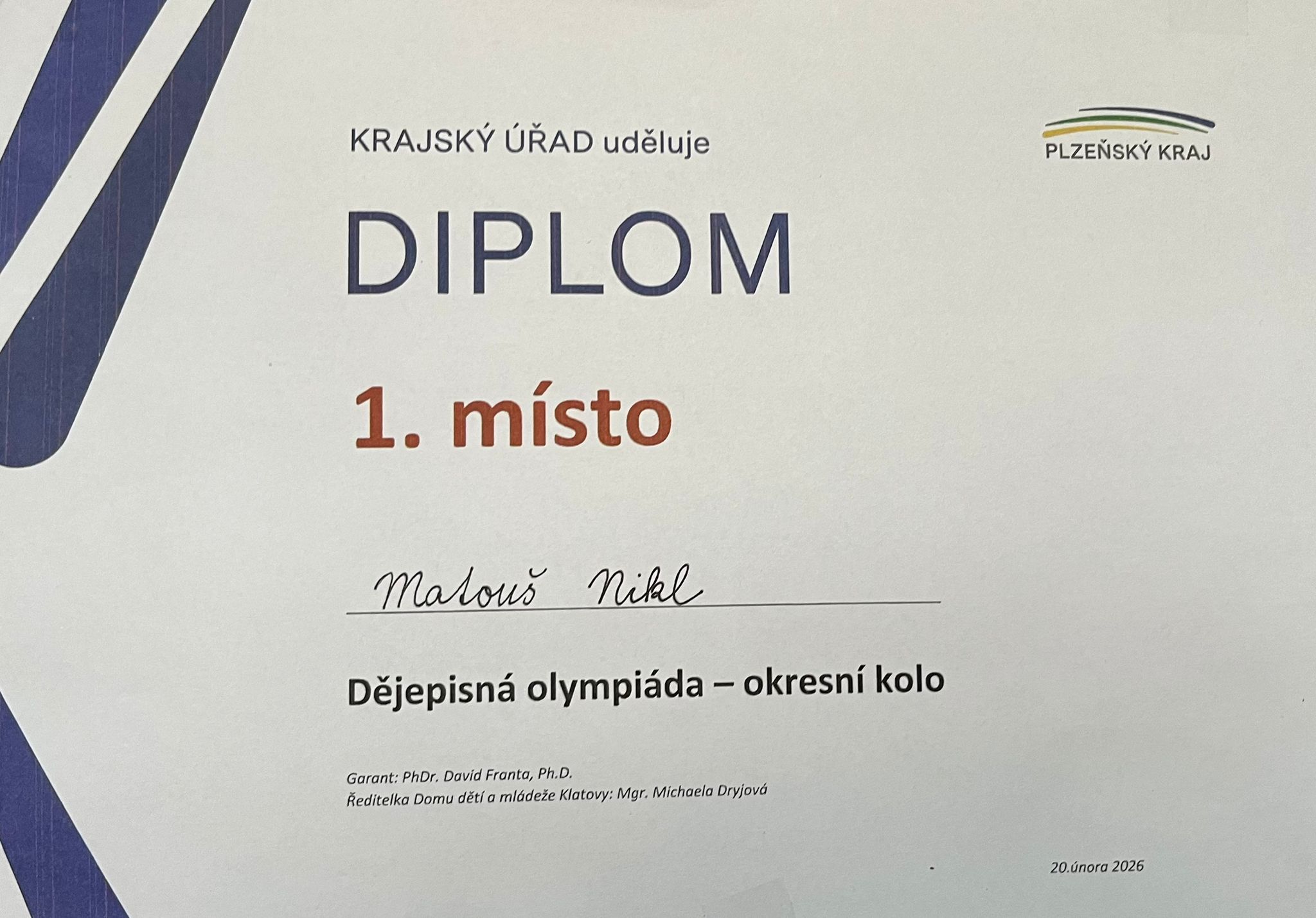 V pondělí 12. ledna se konalo okresní kolo dějepisné olympiády na gymnáziu v Klatovech. Naši školu reprezentovali Matouš Nikl a Sofia Horoszkiewicz. V náročném klání se Sofia umístila z celkového počtu 29 soutěžících na vynikající 12. příčce a Matouš celé kolo vyhrál, čímž si zajistil postup do kola krajského. Navázal tím na své úspěchy z let minulých, neboť se dějepisných olympiád pravidelně účastní již od 5. třídy. Fantastický úspěch!!