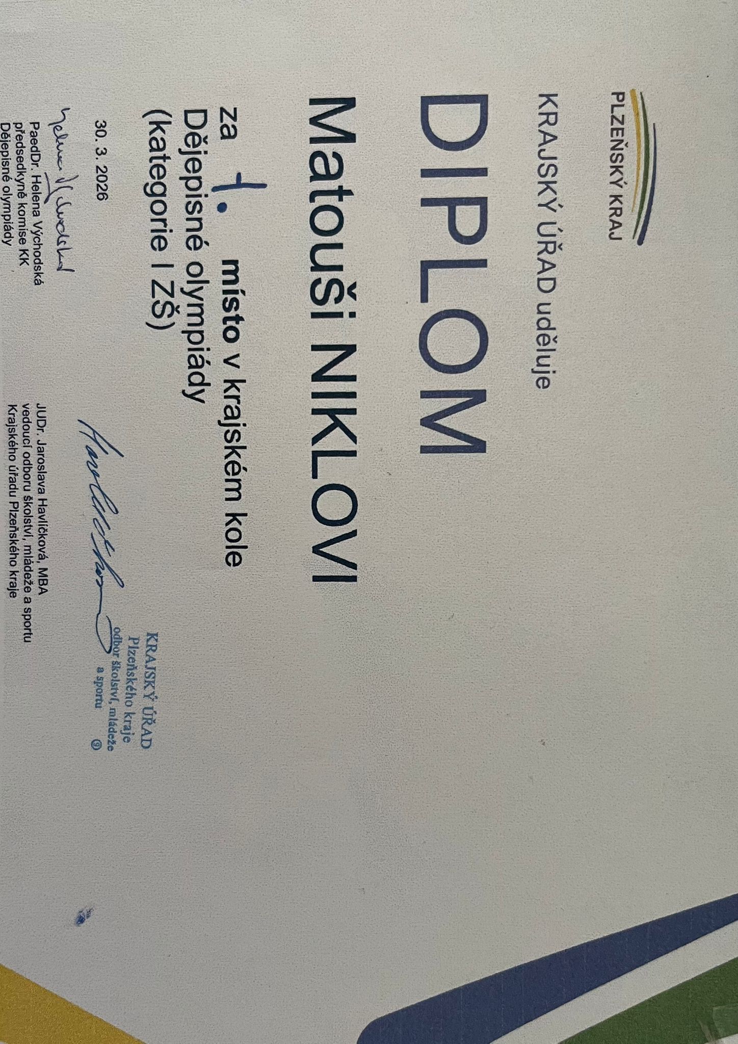 V pondělí 30. března se konalo v Plzni krajské kolo Dějepisné olympiády, ve které reprezentoval chanovickou školu žák 9. ročníku Matouš Nikl.